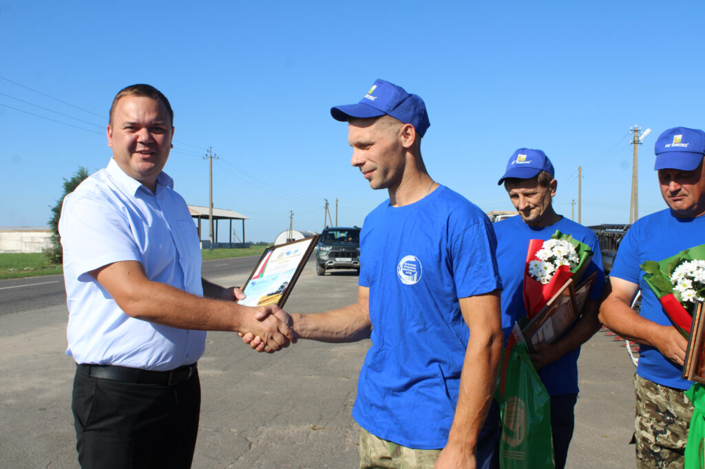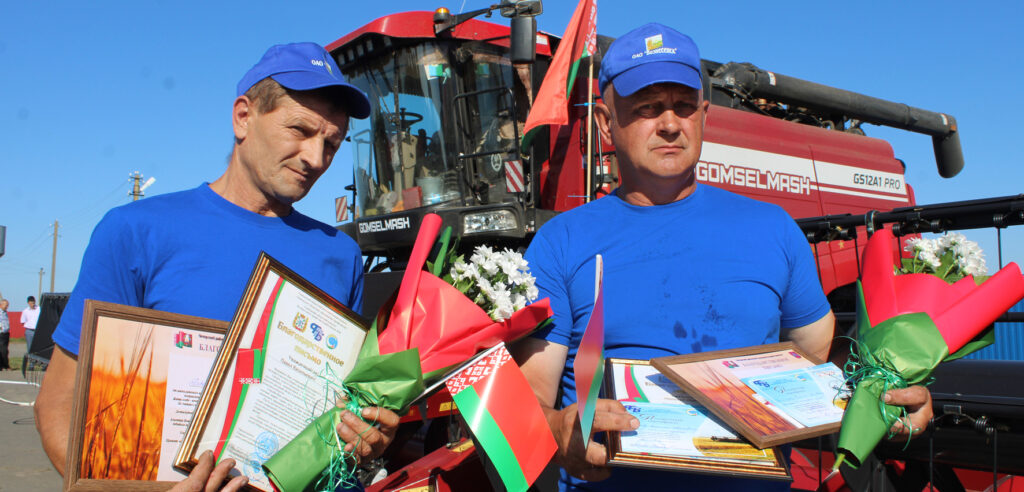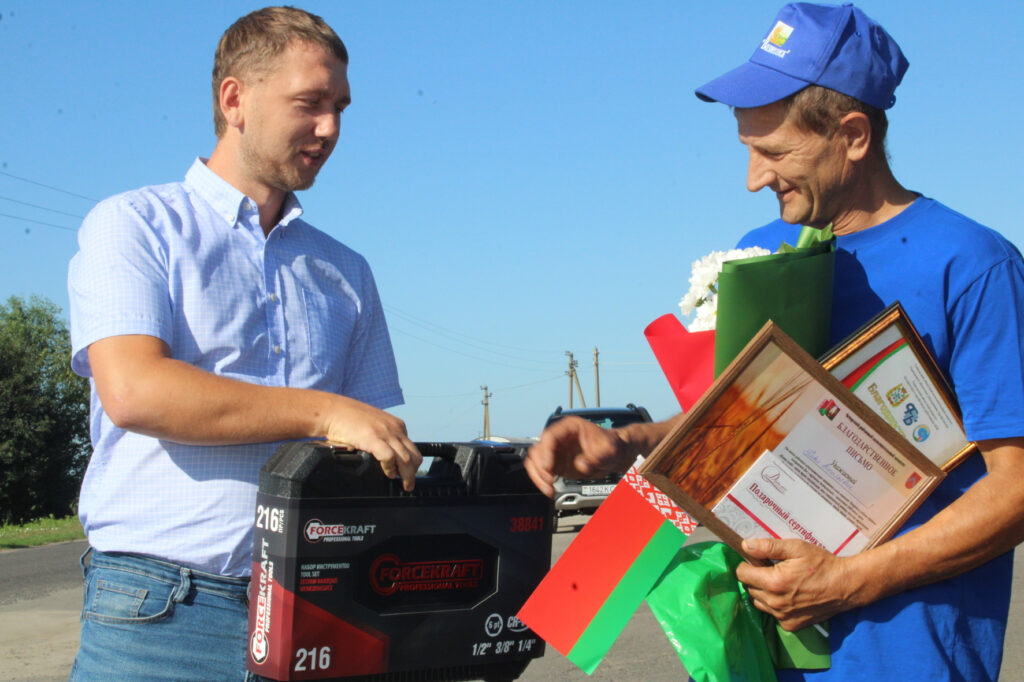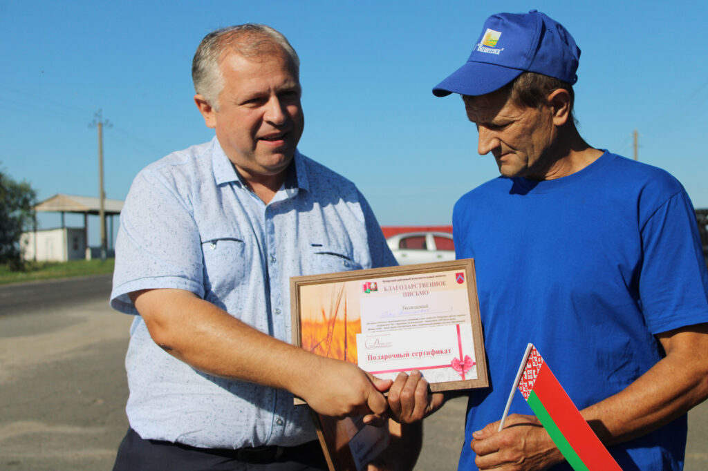 На Чечерщине достигнут результат в 1000 тонн по намолоту. Свою первую тысячу нового урожая этого года собрал с полей экипаж комбайна ОАО «Вознесенск» в составе комбайнера Павла Роева и его помощника Николая Дегтерова. Поздравить героев жатвы прибыли первый зампред райисполкома Виктор Браточкин, профсоюзный лидер сферы АПК Анжелика Кравченко, руководитель хозяйства Артем Ермак, а также пожал руку хлеборобам и вручил благодарственное письмо от Гомельского облисполкома, областного объединения профсоюзов и областного комитета Белорусского профсоюза работников агропромышленного комплекса исполняющий обязанности председателя профсоюзного облкомитета АПК Дмитрий Поляков. К словам благодарности были приложены денежные сертификаты и подарки. Как сказал Дмитрий Михайлович, на Гомельщине торжественно почествовали с высоким результатом в 1000 тонн уже 23 экипажа комбайнов и 35 водителей. Отрадно, что в области среди молодых водителей на отвозке вознесенский Дмитрий Шаманский стал вторым. Апофеозом встречи стал музыкальный номер от Ирины Курдюмовой и вокально-инструментального ансамбля «Люба–Міла».