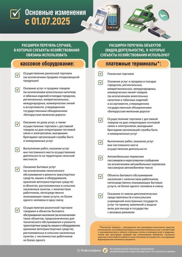 С 1 июля 2025 года расширился перечень случаев, когда субъекты хозяйствования обязаны использовать кассовое оборудование. Так, введена обязанность использования кассового оборудования в следующих случаях: осуществление разносной торговли; оказание услуг и продажа товаров в поездах; оказание на дому услуг, а также осуществление торговли с доставкой товаров на дом операторами почтовой связи и электросвязи, выездными бригадами организаций службы быта и коммунальных услуг; выполнение работ, оказание услуг вне постоянного места осуществления деятельности на территории сельской местности; оказание бытовых услуг и осуществление розничной торговли в объектах, расположенных в сельских населенных пунктах, с количеством работников, непосредственно оказывающих такие услуги, не более одного человека в одну смену.