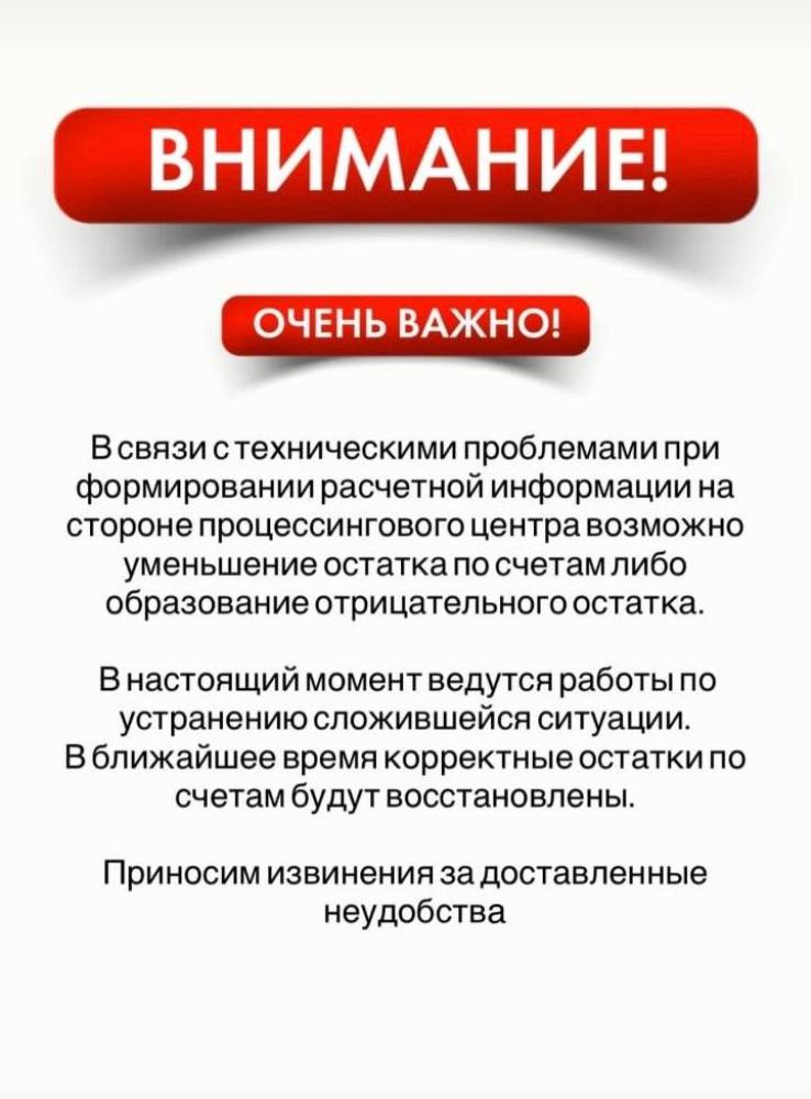 В связи с техническим сбоем, произошедшим сегодня в аппаратно-программном комплексе у держателей карт ОАО “АСБ Беларусбанк”, ОАО “Белагропромбанк” и ОАО “Белинвестбанк” возможно уменьшение остатка по счетам либо образование отрицательного баланса.