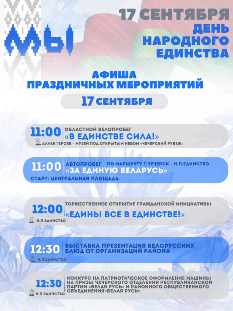 Анонс Программа праздничных мероприятий в Чечерске на День народного единства 12.09.2025 Иллюстрация из открытых источников 17 сентября Чечерщина вместе со всей страной отметит День народного единства. Будет ярко и душевно! Поделиться информацией: Continue Reading Previous Программа праздничных районных мероприятий “Дожинки-2025”Next Что можно посмотреть в чечерском кинотеатре “Октябрь” с 17 по 21 сентября More Stories Анонс Что можно посмотреть в чечерском кинотеатре “Октябрь” с 4 по 7, 10 декабря 01.12.2025 Анонс В Чечерске 29 ноября пройдет областной турнир по дзюдо 28.11.2025 Анонс Что можно посмотреть в чечерском кинотеатре “Октябрь” с 27 по 30 ноября 24.11.2025 Добавить комментарий Отменить ответ Ваш e-mail не будет опубликован.Комментарий Имя E-mail Сайт Δ Этот сайт использует Akismet для борьбы со спамом. Узнайте, как обрабатываются ваши данные комментариев.