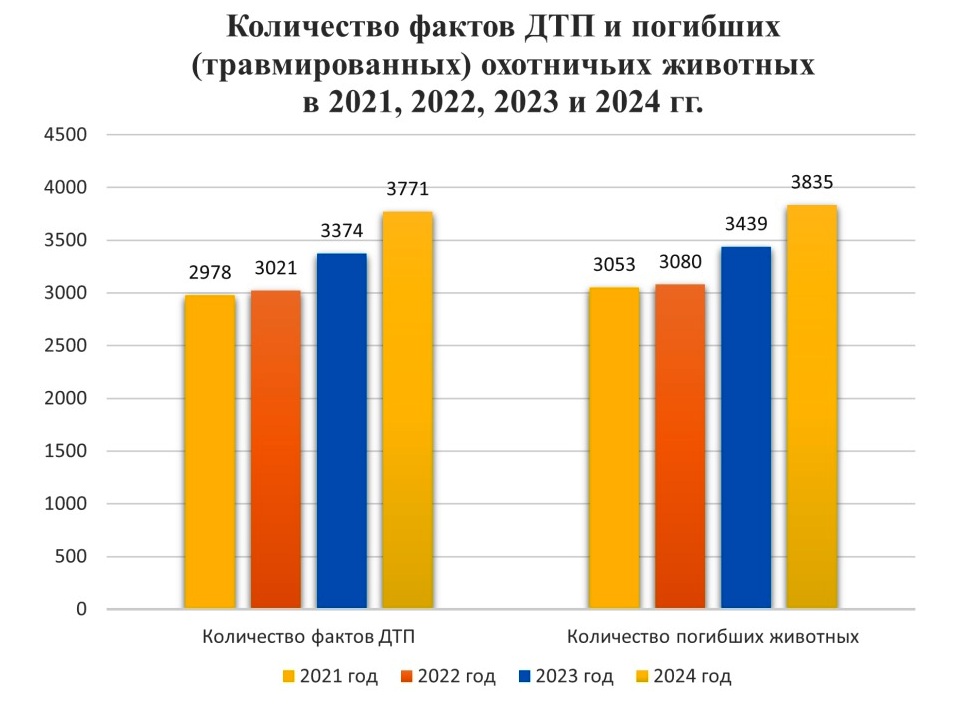 Дежурной службой Государственной инспекции с 2021 года ведется регистрация фактов ДТП с участием диких животных. Данная информация аккумулируется в электронной базе, анализируется и доводится всем заинтересованным госорганам и организациям. При этом сведения о фактах дорожно-транспортных происшествий и погибших (травмированных) диких животных за 2021, 2022, 2023 и 2024 гг. указывают на тенденцию существенного роста количества фактов ДТП в 2023 и 2024 годах.