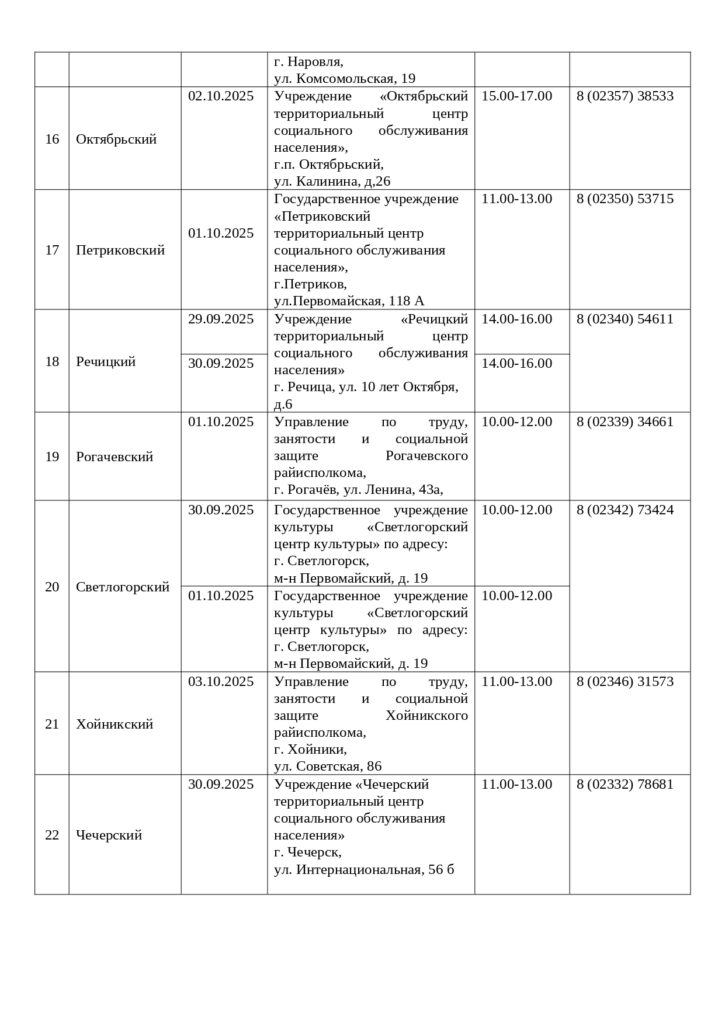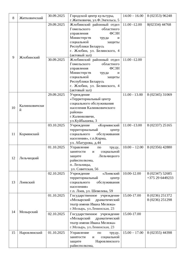 Мероприятия состоятся также в разных районах всех областей. Так, например, в Чечерском районе найти работу можно будет 30 сентября с 11.00 до 13.00 в территориальном центре соцобслуживания населения. Телефон для справок: 7-86-81.