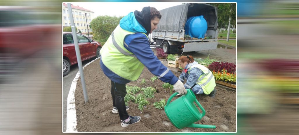 Бригада по благоустройству разбивает клумбы, подготавливает почву и высаживает цинии, бархатцы и другие прекрасные цветы.