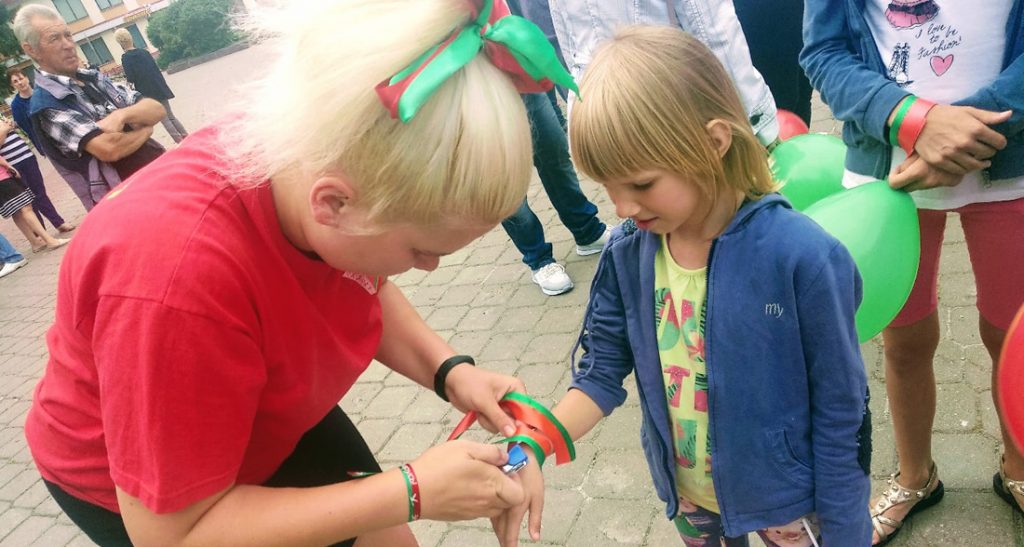 На митингах в поддержку мира, безопасности и спокойствия в Беларуси, а также в определенных местах, согласованных с местными органами власти, активисты союза молодежи бесплатно раздают всем желающим государственные флаги Беларуси и красно-зеленые ленточки.