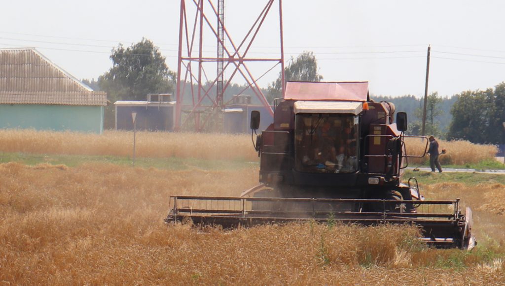На поле застаю заместителя председателя райисполкома Юлию Басаргину (ответственного по хозяйству), руководителя сельхозпредприятия и главного агронома. Николай Гулевич и Владимир Сахаров следят за тем, чтобы не допустить потерь. Они говорят, что собрать до зернышка выращенный урожай – это дело чести. Подключаемся к процессу и мы, дилетанты. Наглядным способом нами не обнаружено потерь за комбайном. Что ж, отлично. Интересуемся, сколько за день поступает зерна от одного комбайна в бункер? Николай Гулевич рапортует: «В среднем одним комбайнером убирается от 60 до 80 гектаров площади. С этой нивы собираем по 150-170 тонн. Урожайность разнится в зависимости от поля. В среднем пока имеем 18,2 ц/га». Всего же в хозяйстве уборке подлежит 2025 гектаров, которые планируем убрать без потерь за 25 дней, уточнил руководитель.