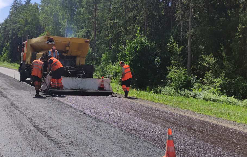 Работники ДЭУ-46 приступили к устройству тонкослойного защитного слоя покрытия 9-километрового участка автодороги от Залесья до моста через речку Молинка в Красном Береге.