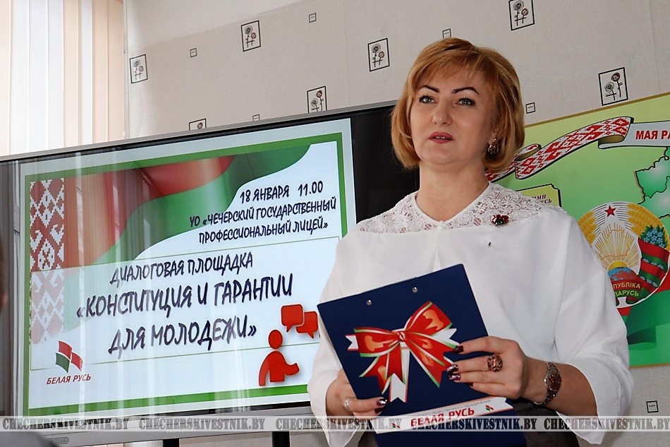 Павел Рахимов: – Мой прадед воевал. Часто рассказывал, через какой ад пришлось пройти военному поколению. Он всегда хотел, чтобы я рос настоящим патриотом. Наверное, поэтому меня больше всего затронула на диалоговой площадке тема патриотизма. Встреча позволила еще больше убедиться в том, что изменения в Основной закон сейчас нам просто необходимы. У меня нет сомнений, что они направлены на процветание и мир в нашей стране. «Обсуждение проекта Конституции – это та тема, которая в последнее время лидирует в белорусском обществе. Наша страна на пороге конституционного референдума, и очень важно не только услышать мнения народа, но и донести до него разъяснения по предлагаемым изменениям. Для «Белой Руси» работа с молодежью в этом плане вышла на первый план. Ведь молодежь – это будущее нашей страны, и задача взрослых объяснить, что изменения в Конституцию нужны в первую очередь ей. Надеюсь, что у нас это получается», – подвела итог встречи с чечерскими лицеистами заместитель председателя Гомельской областной организации «Белая Русь» Наталья Мамрукова.