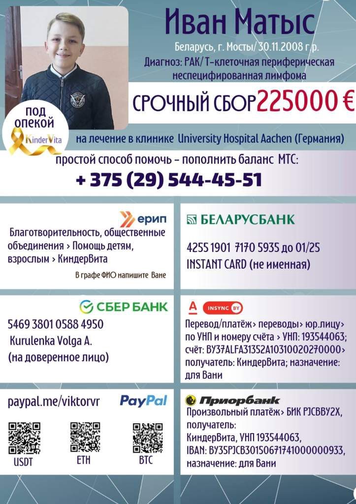 Добрые люди подсказали, что в Германии данное заболевание успешно лечится. В городе Аахен в университетской клинике есть профессор, который более 15 лет жизни посвятил лечению лимфом. Родители Вани написали ему письмо и получили ответ.