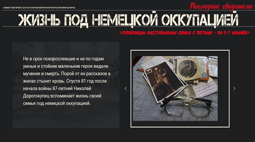 Белорусское телеграфное агентство в совместных проектах с Генеральной прокуратурой “Последние свидетели” и Министерством юстиции “Архивы. Ничего, кроме правды” открывает малоизвестные архивные документы о геноциде белорусского народа во время Великой Отечественной войны. Все серии проектов размещены на единой электронной платформе “За печатью памяти”.