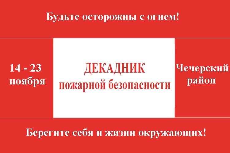 В связи с увеличением количества погибших на пожарах на территории района с 14 по 23 ноября объявлен декадник пожарной безопасности по предупреждению гибели людей в огне. В этот период члены смотровых комиссий усилят работу по проведению обследований домовладений, в которых проживают граждане, ведущие асоциальный образ жизни и склонные к злоупотреблению спиртными напитками.