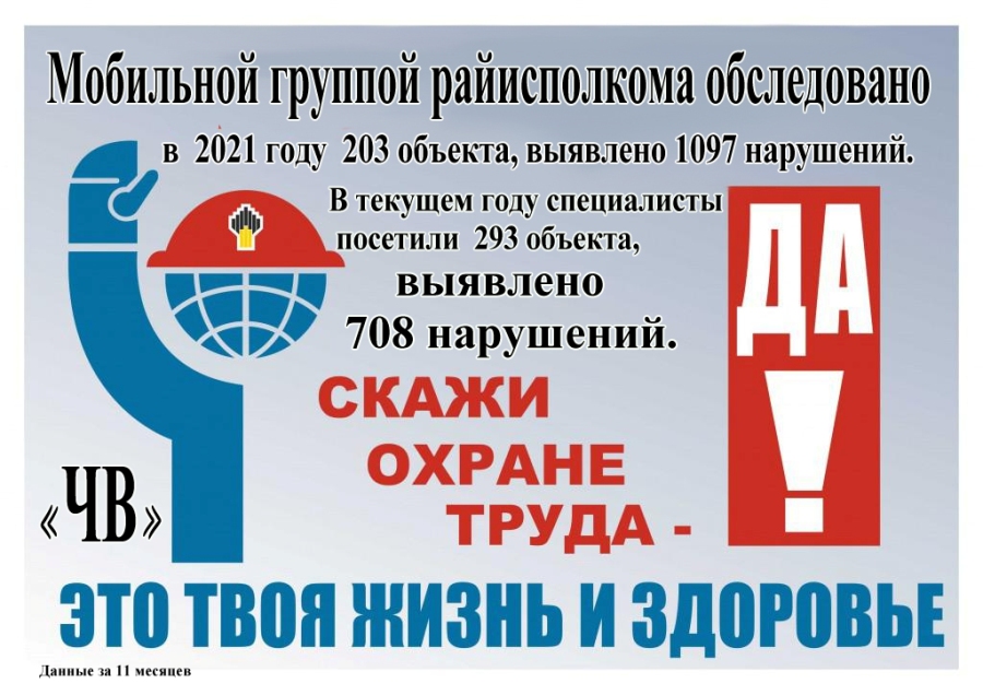 Как рассказала начальник управления по труду, занятости и социальной защите Елена Минина, мобильной группой райисполкома за 11 месяцев текущего года посещено 98 организаций, обследовано 195 объектов, выявлено 708 нарушений, в том числе 435 в области охраны труда.