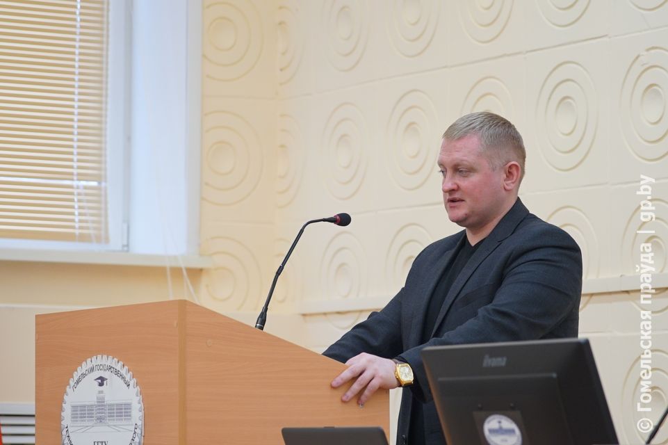 С молодежью ГГТУ имени П. О. Сухого встретились директор информационно-просветительского учреждения «Актуальная концепция» политолог Александр Шпаковский и заместитель генерального директора ОАО «Камволь» Егор Макаревич. В лекционной аудитории не было свободного места — около 100 студентов различных курсов пришли пообщаться со спикерами.