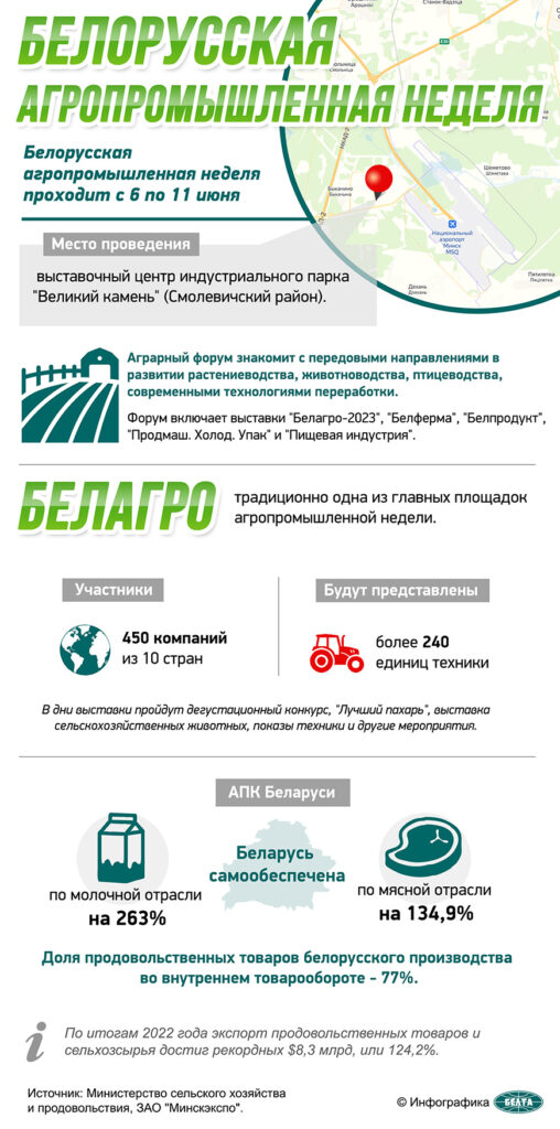 Международная специализированная выставка “Белагро-2023” проходила с 6 по 11 июня на базе выставочного центра Китайско-белорусского индустриального парка “Великий камень”. В этом году участие в выставке приняли 450 компаний из 10 стран мира.