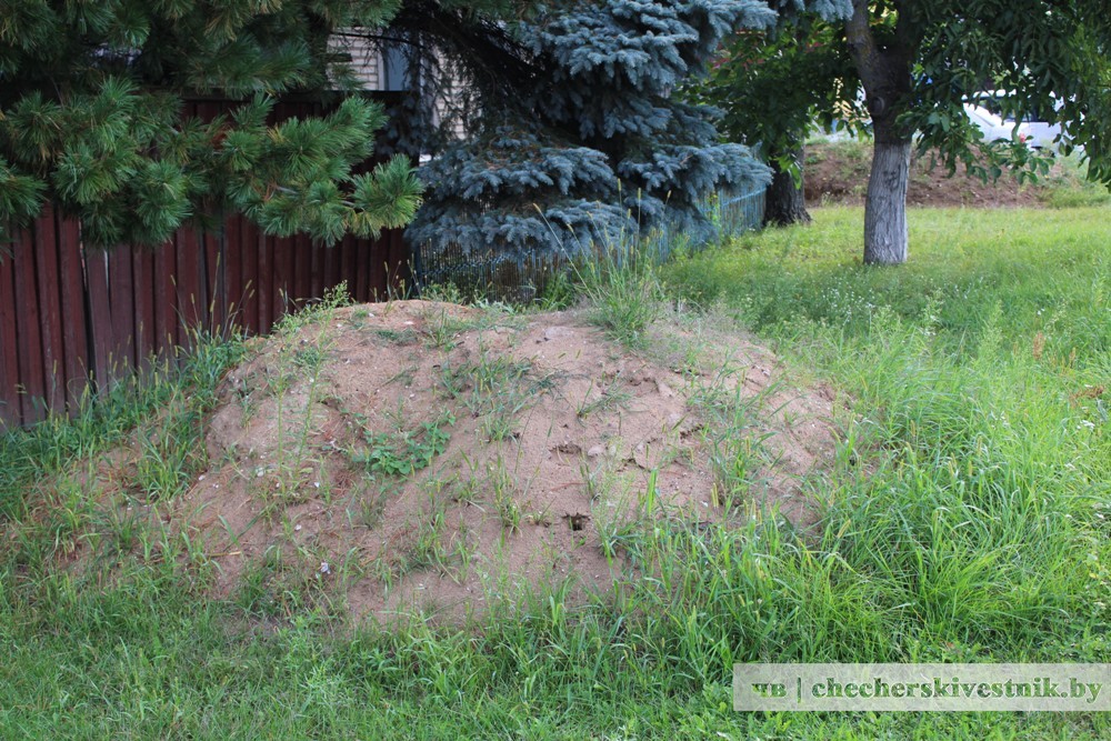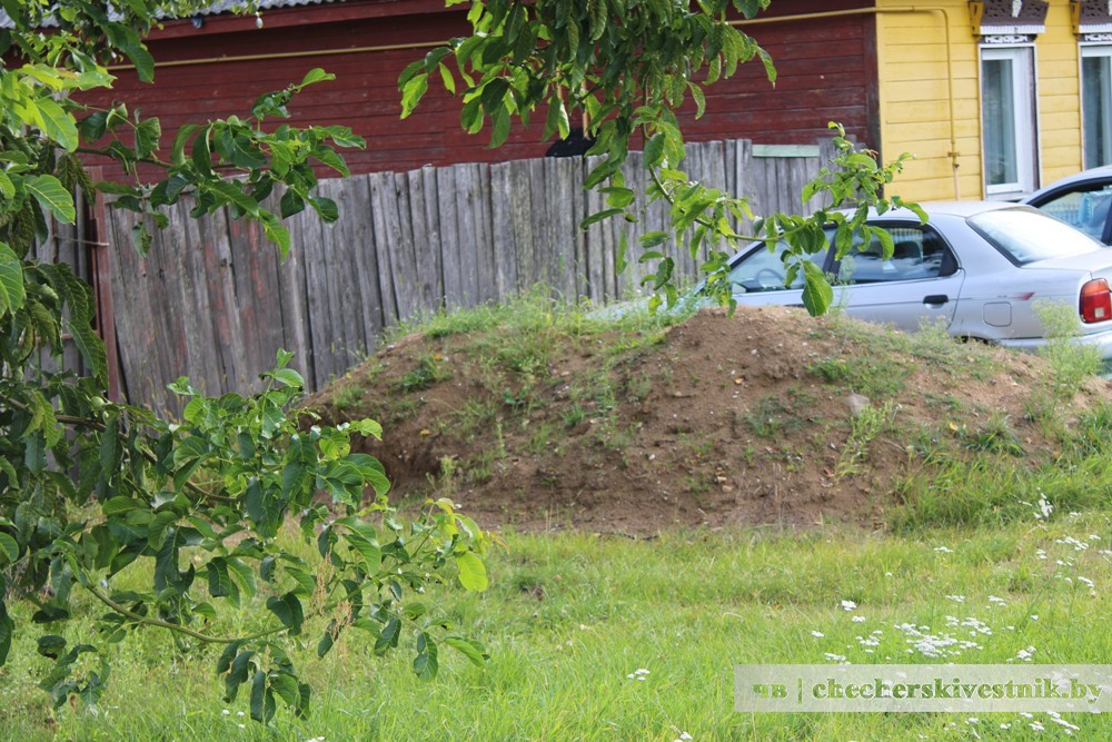 Две огромные кучи песка по ул.Карла Маркса в Чечерске за несколько месяцев обросли травой и создают неприглядный облик.