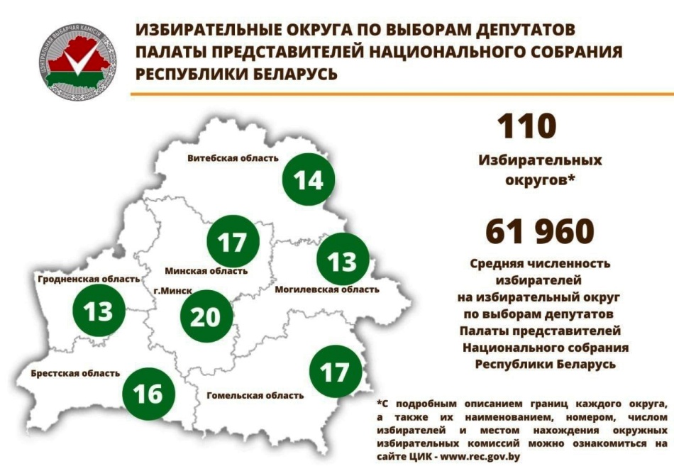 Центральной комиссией установлена средняя численность избирателей по выборам депутатов Палаты представителей Национального собрания Республики Беларусь в количестве 61 960. “Аналогичные решения приняты на местах, определено также количество округов, которые будут образовываться к выборам депутатов местных советов, эта цифра составит 12514 округов, что на 5,5 тыс. меньше в сравнении с кампанией 2018 года. Количество советов уменьшилось на 25. Всего в стране будет сформировано 1284 Совета депутатов”, – дополнил глава ЦИК.