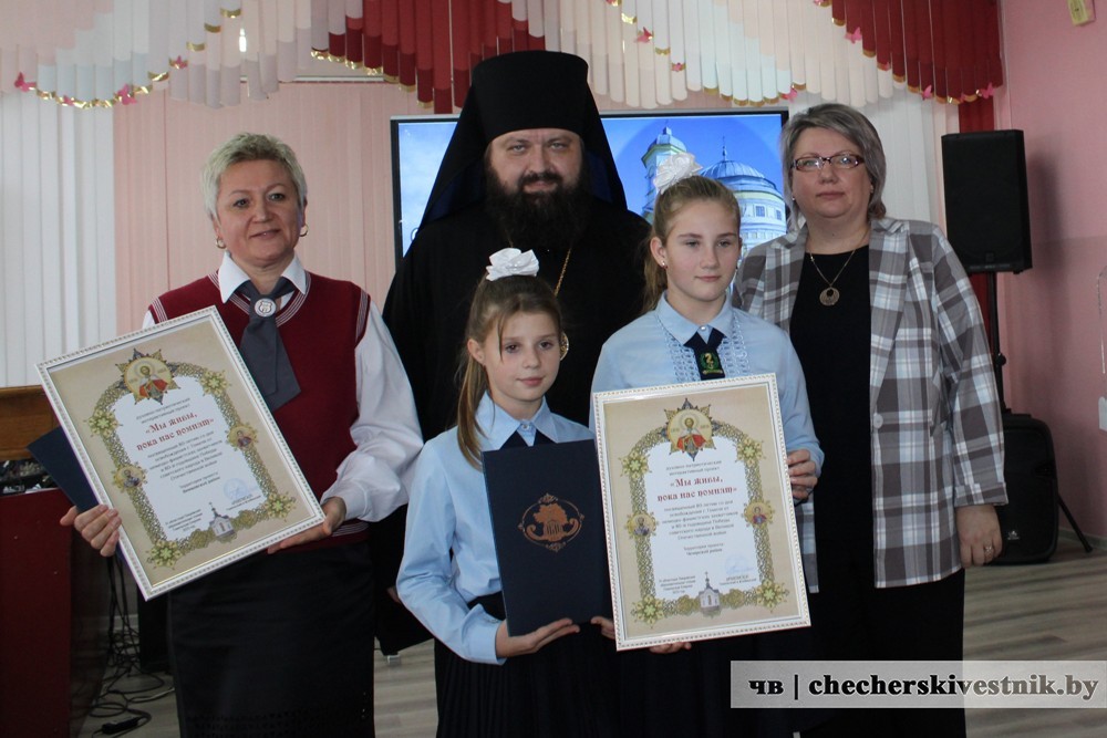 С приветственным словом перед собравшимися выступил Преосвященный Амвросий, епископ Светлогорский, викарий Гомельской епархии. В ходе выступления Владыка презентовал присутствующим духовно-патриотический интерактивный проект Гомельской епархии и Гомельского облисполкома «Мы живы, пока нас помнят», посвященный воинам, освободившим Гомельскую область от немецко-фашистских захватчиков. Затем вниманию зрителей был показан видеоролик, рассказывающий о часовне святого Александра Невского в Гомеле и будущем проекте. По его окончании Преосвященный Амвросий передал начальнику отдела образования Чечерского района Алле Гулевич и представителям Ветковского отдела образования свидетельствующие грамоты.