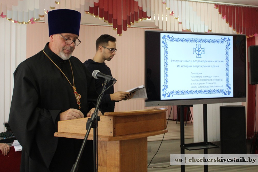 Большой интерес у участников Покровских чтений вызвал доклад настоятеля прихода храма Покрова Пресвятой Богородицы в агрогородке Ботвиново Александра Хамылевского на тему «Разрушенные и возрожденные святыни. Из истории возрождения храма». Свое выступление отец Александр посвятил истории церквей Чечерщины, подробнейшим образом рассказав о том, как действовал и был разрушен в богоборческие времена храм Воскресения Христова в Меркуловичах, и о той связующей нити, которая стала возможной при строительстве нового храма Покрова Пресвятой Богородицы. Священником были предоставлены уникальные исторические документы и фотографии по заявленной теме. Так, после перехода церкви из унии в Православие новый храм, построенный генералом Алексеем Ивановичем Васильевым – первым министром финансов Российской империи, был внушительным по своим масштабам. В одной связке с храмом была колокольня. На ней находилось 15 колоколов с общей массой 525 кг. Самый большой колокол весил 272 килограмма, а самый малый – всего 2,5 кг. Священник рассказал о том, что прихожан в то далекое время насчитывалось более 5 тысяч человек. Меркуловичский храм Воскресения Христова – это наше общее огромное наследие и память о нем мы должны свято хранить. Крепкой связующей нитью стало празднование в этом году 230-летнего юбилея храма у креста, установленного в его честь и память. Прошло торжественное Пасхальное богослужение и концертная программа, которые подарили людям духовную радость. Отец Александр рассказал и о последнем настоятеле утраченной святыни иеромонахе Антонии Манине, который был подвергнут гонениям со стороны властей, но оставался крепким в своей вере и убеждениях. Он возглавлял монашескую общину, действовавшую в деревне Причалесня. Уникальна история строительства храма Покрова Пресвятой Богородицы в агрогородке Ботвиново. Первая Литургия состоялась 19 февраля 2012 года. Она промыслительным образом соединила разрушенный и возведенный храмы, несмотря на разделяющий их отрезок времени.