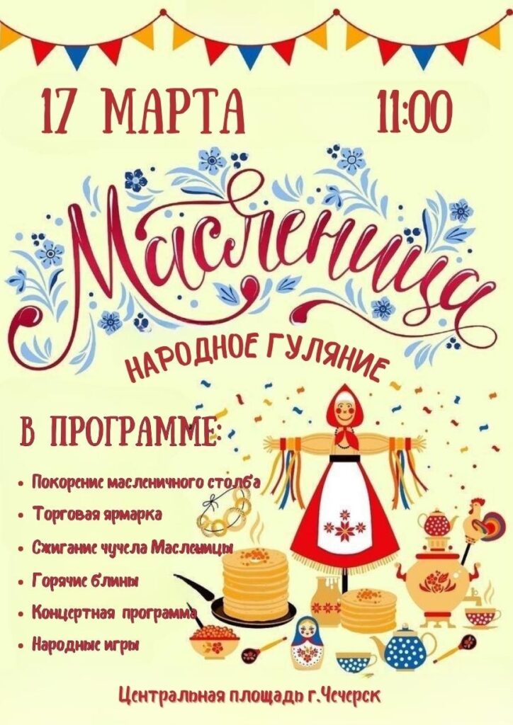 Анонс 17 марта в Чечерске пройдет народное гулянье “Масленица” 13.03.2024 17 марта на центральной площади города пройдет народное гулянье “Масленица”. В программе: концертная программа, горячие блины, игры и конкурсы, покорение масленичного столба, ярмарка. Начало в 11.00. Поделиться информацией: Continue Reading Previous Что можно посмотреть в кинотеатре “Октябрь” с 13 по 17 мартаNext Афиша мероприятий, посвященных Дню Конституции Республики Беларусь More Stories Анонс Что можно посмотреть в чечерском кинотеатре “Октябрь” с 4 по 7, 10 декабря 01.12.2025 Анонс В Чечерске 29 ноября пройдет областной турнир по дзюдо 28.11.2025 Анонс Что можно посмотреть в чечерском кинотеатре “Октябрь” с 27 по 30 ноября 24.11.2025 Добавить комментарий Отменить ответ Ваш e-mail не будет опубликован.Комментарий Имя E-mail Сайт Δ Этот сайт использует Akismet для борьбы со спамом. Узнайте, как обрабатываются ваши данные комментариев.
