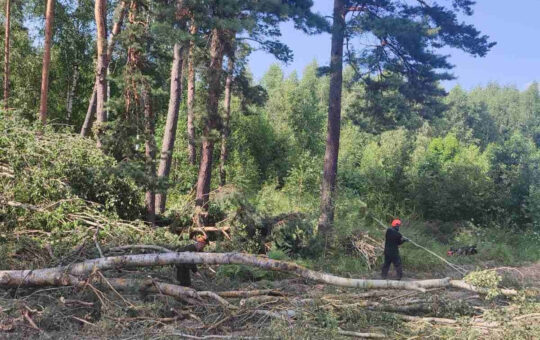 Лесники заняты уборкой ветвей и деревьев, упавших во время ураганного ветра на придорожную полосу на трассе Р38. Таким образом, обеспечивается...