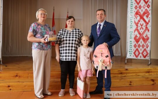 Первый школьный ранец с тетрадями, творческими наборами, альбомом и многими другими необходимыми предметами от депутатского корпуса будущей школьнице Евгении Лысенковой...
