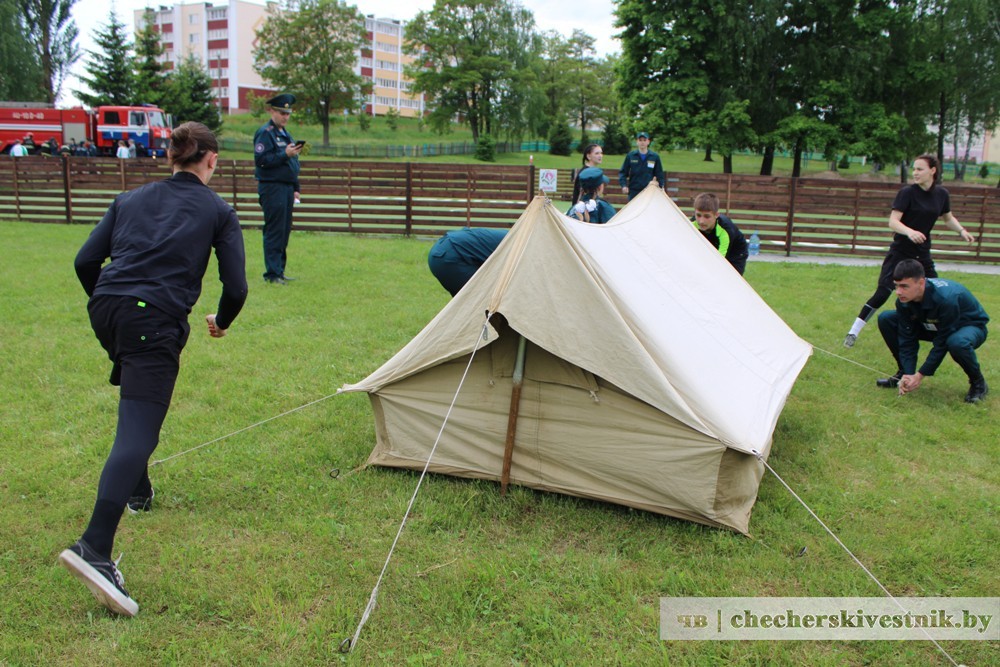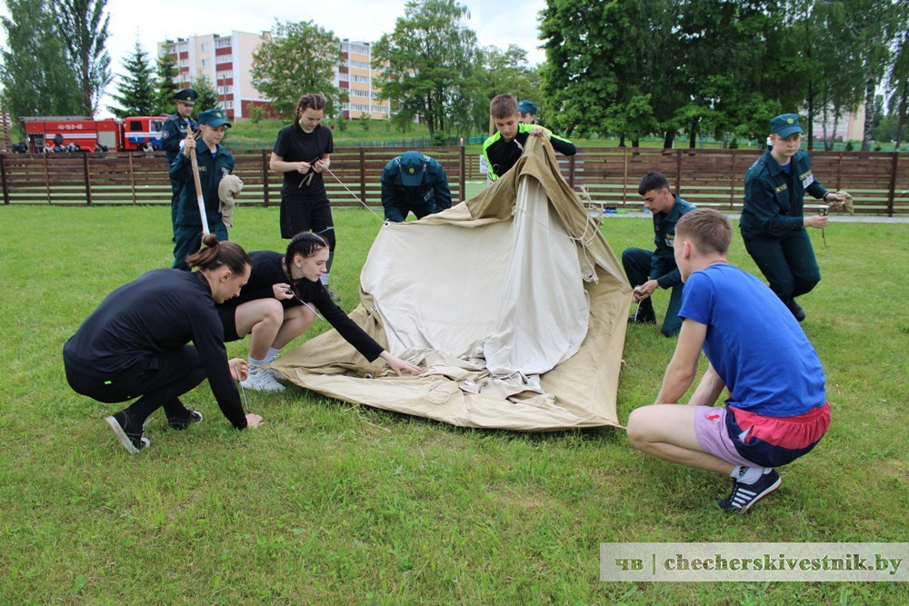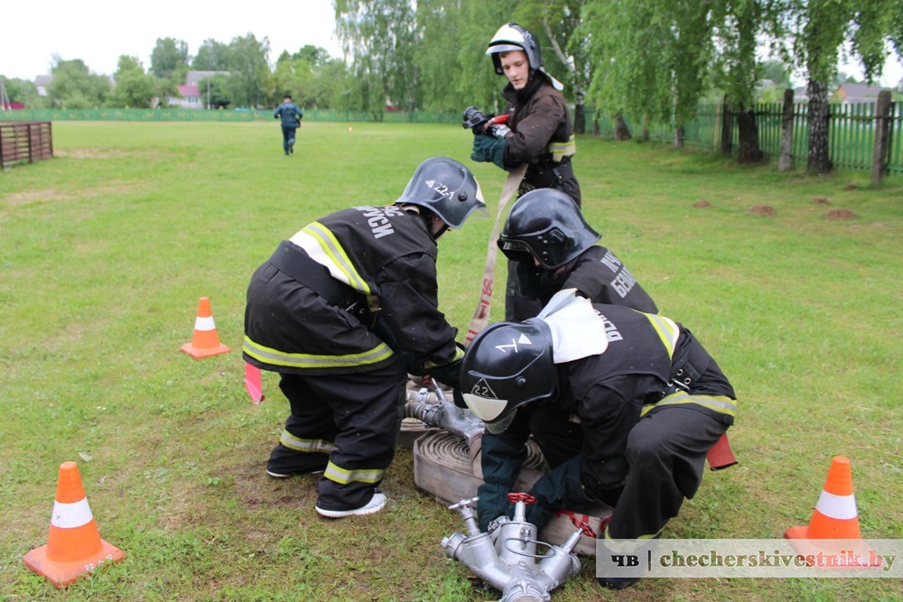 Чтобы добраться до финишной прямой, юным спасателям необходимо было преодолеть множество препятствий, касающихся наиболее важных сторон профессии. Тестирование по основам безопасности жизнедеятельности, оказание доврачебной помощи, состязание на меткость, по установке палатки, боевому развертыванию. И, конечно же, парням и девчонкам нужно было показать себя на плацу. Сразу отметим, что в строевом смотре наши юные спасатели выглядели весьма эффектно: ровным строем, чеканным шагом ребята синхронно выполняли команды своего лидера. Объединенные общей идеей оказывать помощь людям, соперники с азартом устанавливали палатку и стреляли по мишеням. Однако самым ярким по накалу эмоций стало развертывание рукавной линии. Здесь от слаженных действия всей команды зависело место в турнирной таблице. И чечеряне вновь оказались на высоте. Их результат 1.10 минуты – стал лучшим. Но соревнования – есть соревнования. Сильнейшими оказались ребята команды Гомельского района, чечеряне заняли второе место, а замкнули тройку лидеров школьники из Добруша. Спонсорами мероприятия выступили райком РОО «Белая Русь» и отдел образования райисполкома.