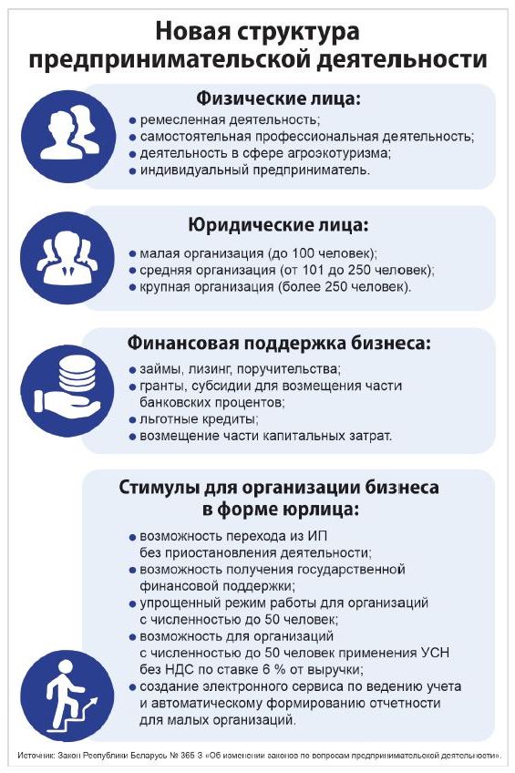 22 апреля Александр Лукашенко подписал закон по вопросам предпринимательской деятельности. Он устанавливает обновленную архитектуру предпринимательства и предусматривает две категории, занимающиеся предпринимательской деятельностью: юридические и физические лица. Виды деятельности, которые смогут осуществлять индивидуальные предприниматели, будут определены Правительством до 1 июля. При этом вводится упрощенный порядок перехода в коммерческие организации с преемственностью по всем правам и обязательствам перед бюджетом и контрагентами. Есть и бонусы — предусмотрены новые виды финансовой поддержки.