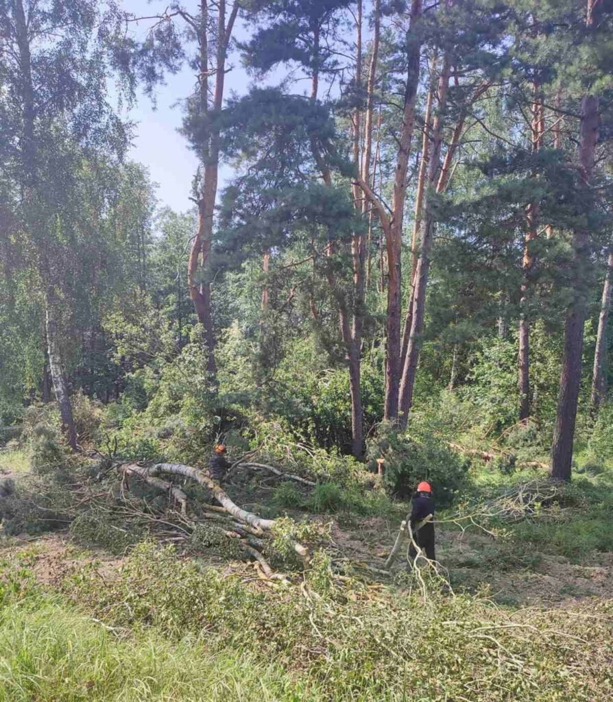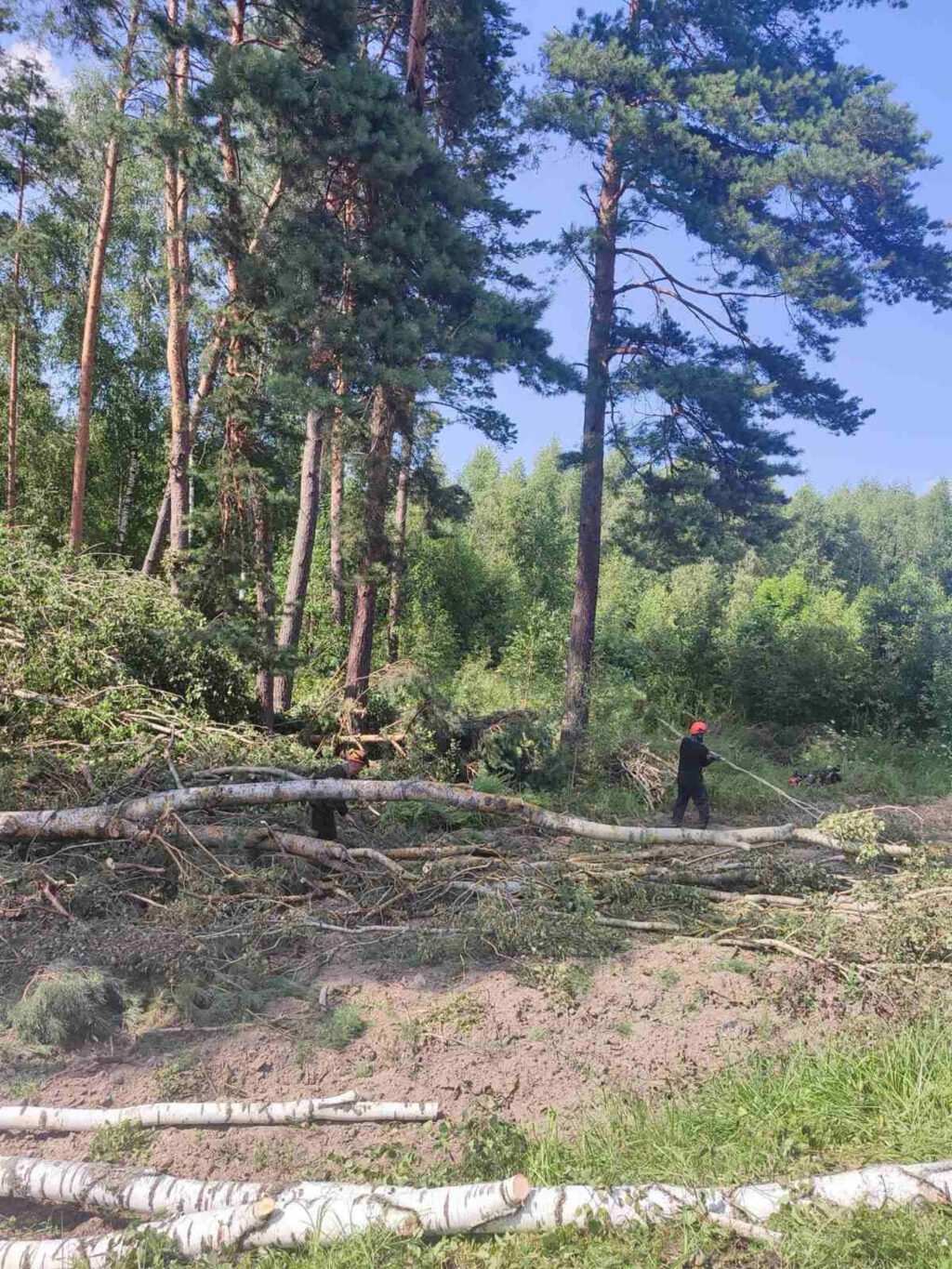 Лесники заняты уборкой ветвей и деревьев, упавших во время ураганного ветра на придорожную полосу на трассе Р38. Таким образом, обеспечивается безопасность для участников дорожного движения.
