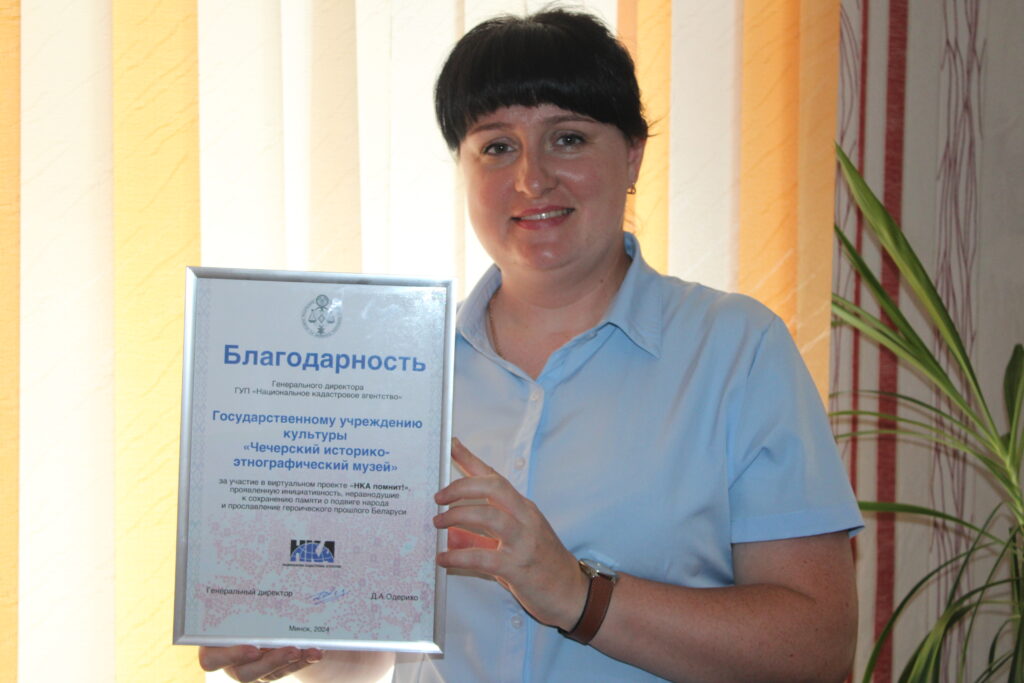 Историко-этнографический музей отмечен благодарностью Генерального директора ГУП «Национальное кадастровое агентство» за участие в виртуальном проекте «НКА помнит!», проявленную инициативность, неравнодушие к сохранению памяти о подвиге народа и прославление героического прошлого Беларуси.
