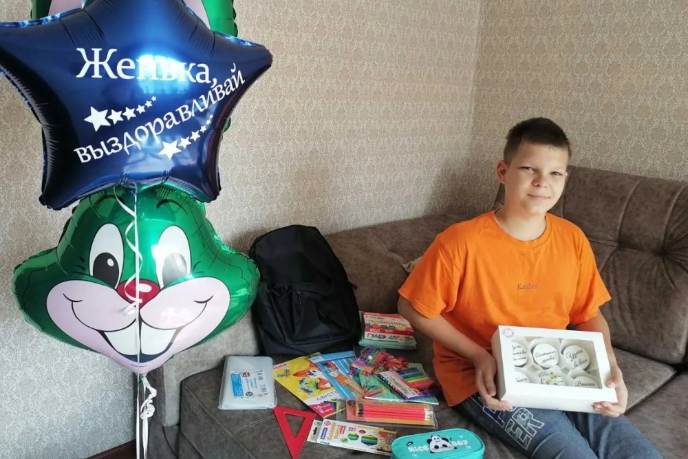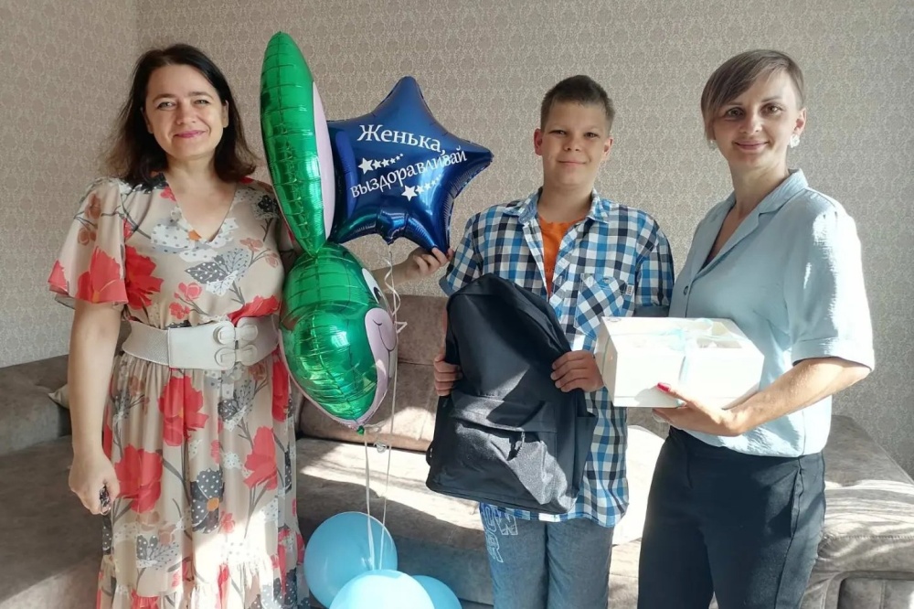 Гости заглянули к Жене Евдокименко, поддержать которого также решила профсоюзный активист Светлана Лобанова. В подарок мальчику она приготовила сладости.