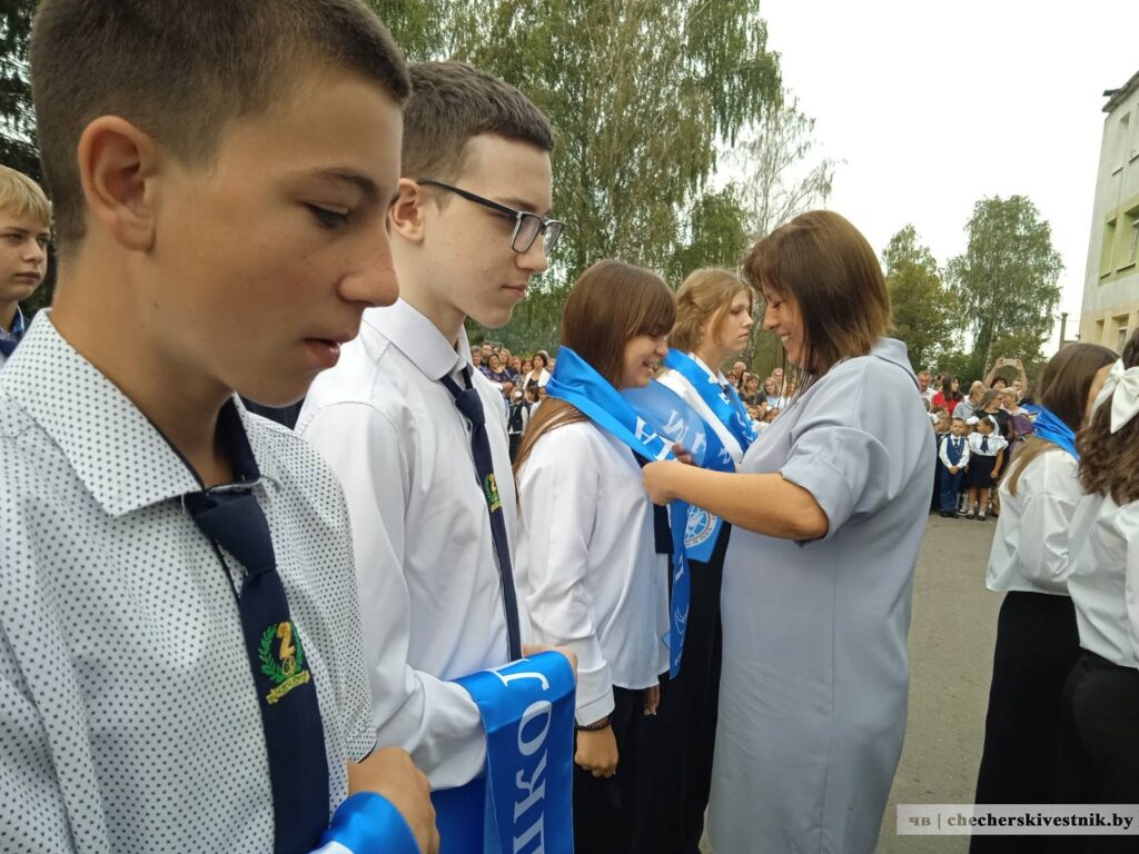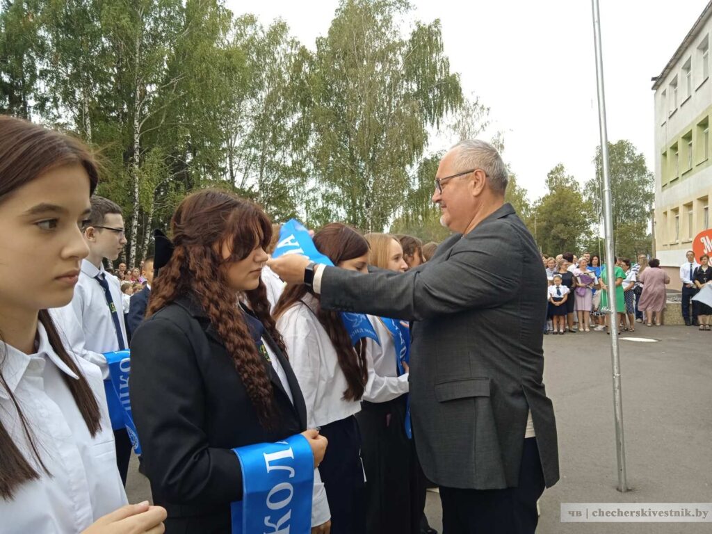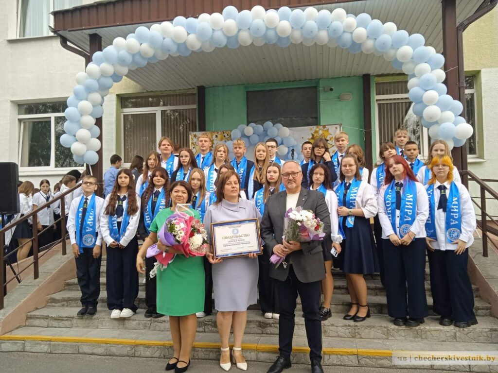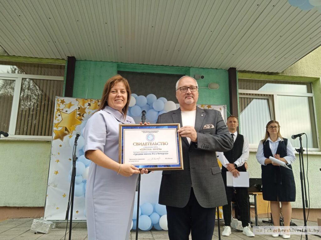 Соответствующее свидетельство на торжественной линейке, посвященной Дню знаний, директору Ольге Цалко вручил заместитель председателя правления Гомельского отделения Белорусского фонда мира Владимир Восарев.