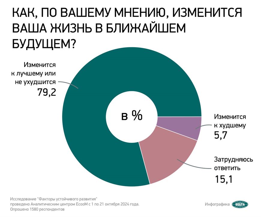 Респондентам предлагалось ответить на вопрос “Как, по вашему мнению, изменится ваша жизнь в будущем?”. “Изменится к лучшему или не ухудшится” ответили 79,2% опрошенных, “изменится к худшему” – 5,7%, “затрудняюсь ответить” – 15,1% респондентов.