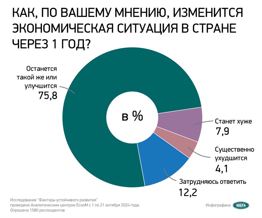 Респондентам предлагалось ответить на вопрос: “Как, по вашему мнению, изменится экономическая ситуация в стране через год?”. В итоге “останется такой же или улучшится” ответили 75,8% опрошенных, “станет хуже” – 7,9%, “существенно ухудшится” – 4,1%, “затрудняюсь ответить” – 12,2% респондентов.