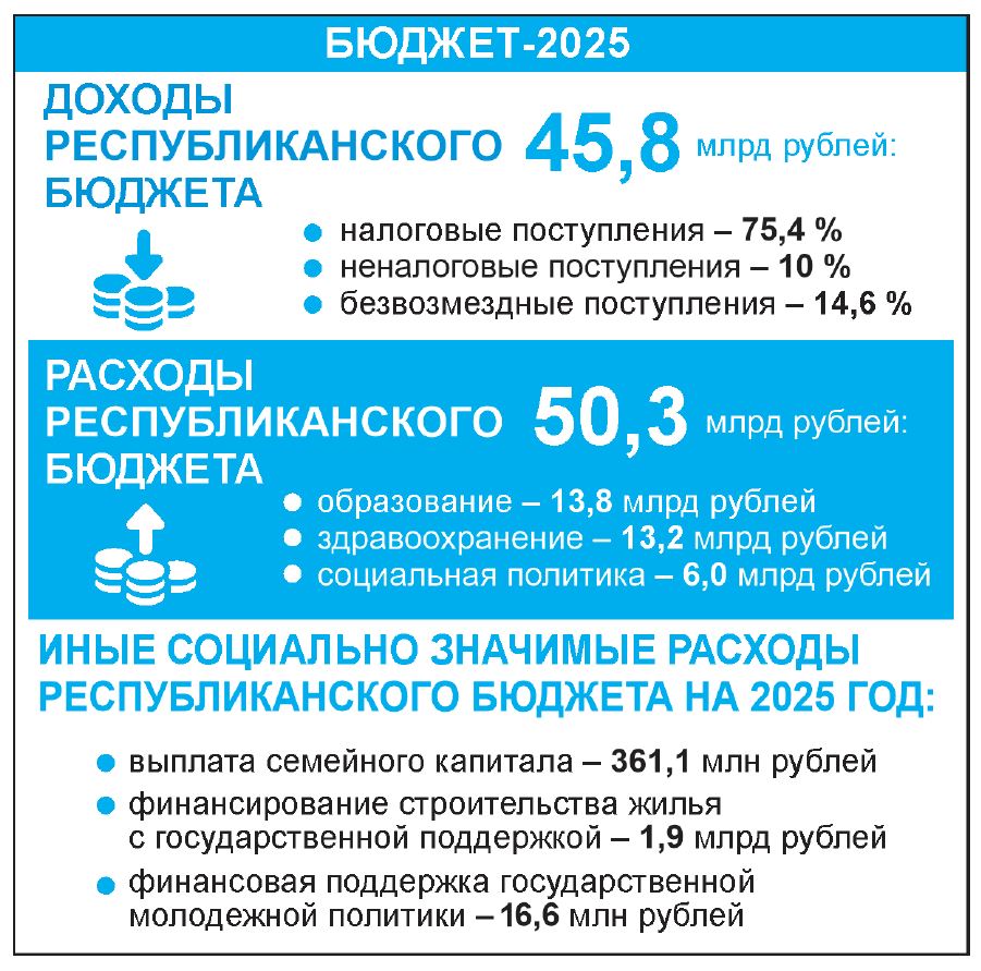 — Доходы консолидированного бюджета оцениваются в 78,7 млрд рублей, республиканского — 45,8 млрд. Расходная часть консолидированного бюджета сформирована в сумме 83,9 млрд рублей, республиканского — 50,3 млрд рублей, — отметил министр финансов Юрий Селиверстов. — В 2025 году наибольший удельный вес в структуре доходов республиканского бюджета составят НДС — 41,6 процента, доходы от внешнеэкономической деятельности — 17,5 процента, акцизы — 6,6 процента и налог на прибыль — 6 процентов.