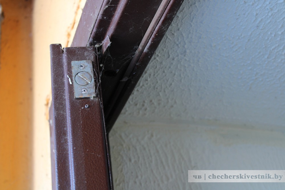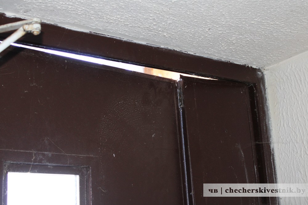 Металлическая створка по каким-то причинам была деформирована. Поэтому сверху не прилегала и тем самым не давала возможности полностью закрыть дверь. В результате гигакалории тепловой энергии “улетучивались”. Еще одним неприятным следствием этой ситуации являлось то, что при сильном ветре и метели снег задувало в тамбур.