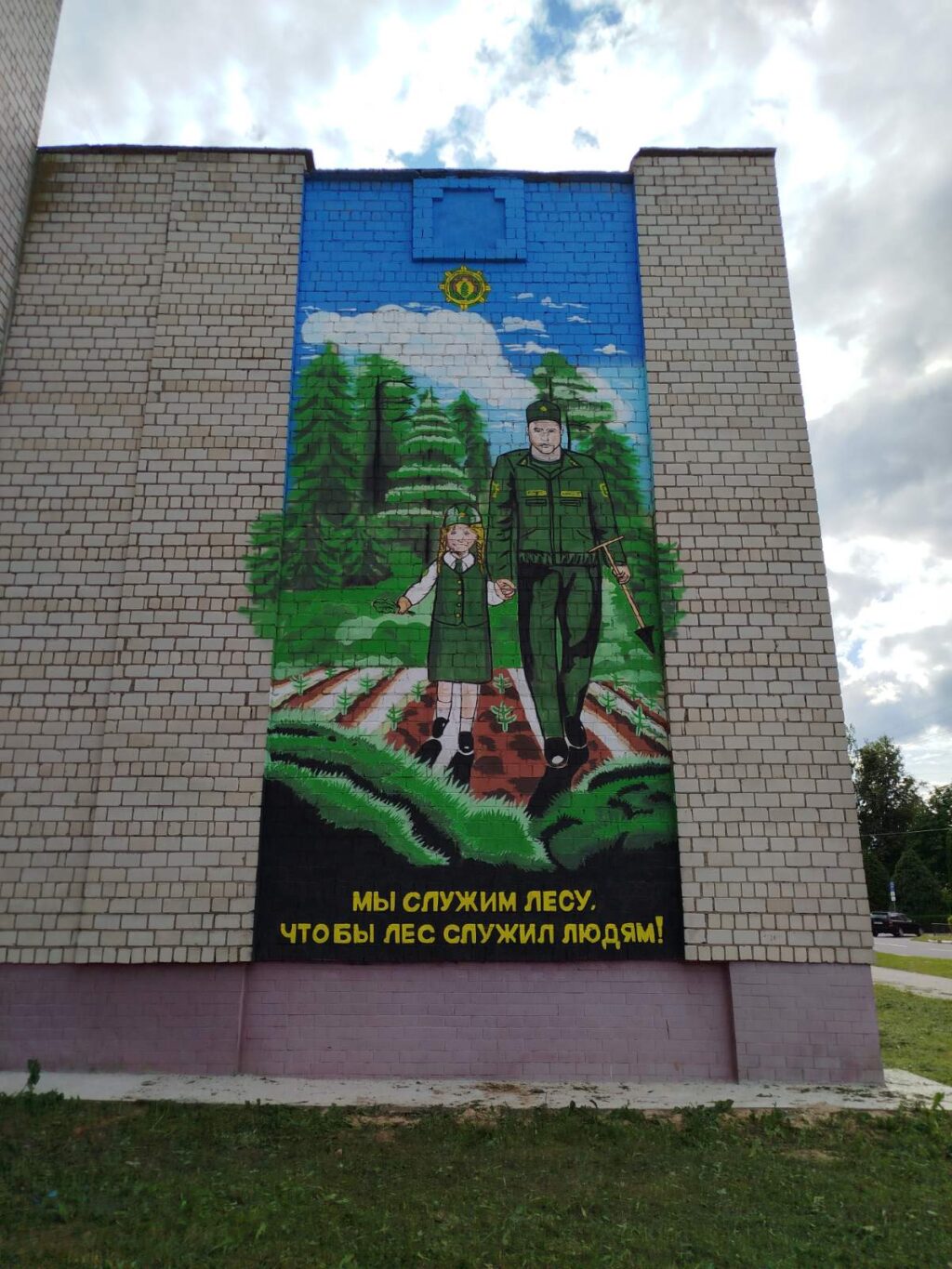 Это крупномасштабное художественное изображение символизирует работу лесоводов и то, что благородную миссию – заботу о лесных массивах – они стремятся передать юному поколению.