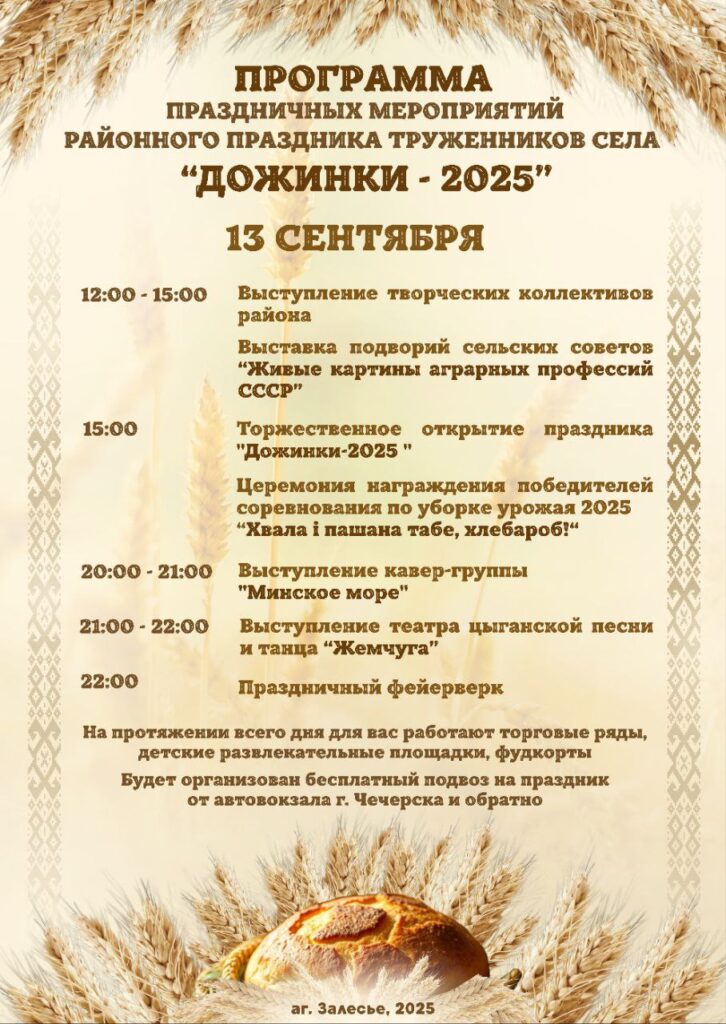 В агрогородке Залесье 13 сентября пройдет районный праздник “Дожинки”. Он станет триумфом трудовых побед всех тех, кто на хлебной ниве проявил усердие, высокую ответственность и безграничную любовь к родной земле.