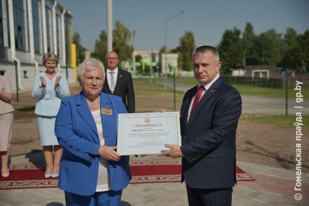 Сертификат на 100 тысяч белорусских рублей председатель облисполкома вручил гимназии на развитие материально-технической базы.