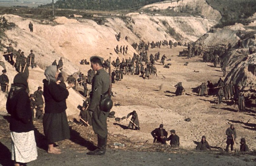 Первыми, а случилось это 27 сентября, здесь убили 752 пациента психиатрической клиники им. Ивана Павлова. Расстрелы продолжились через два дня и вошли в летопись Великой Отечественной как самые бесчеловечные и жестокие. Нацисты развесили на улицах столицы более двух тысяч объявлений с приказом явиться всему еврейскому населению 29-го числа к 8.00 на сборный пункт на углу улиц Мельника и Дегтяревской, взяв с собой документы, ценности и теплые вещи. Якобы для переписи населения, после чего все евреи и их дети, как элитная нация, будут переправлены в безопасные места. За невыполнение приказа полагался расстрел. На самом же деле им была уготована смерть. Всех собравшихся колонной уводили в сторону Бабьего Яра. Непрерывным потоком, с утра и до ночи, люди шли по улице, с двух сторон охраняемые немецкими патрулями. На подходе к месту казни их раздевали догола, и группами по 30-40 человек полицейские палками загоняли в овраг глубиною до 25 метров. Жертв расстреливали члены зондеркоманды 4 “a” спецподразделения айнзатцгруппы “C” при участии 45-го и 303-го батальонов немецкой полиции порядка полицейского полка “Юг” и украинской вспомогательной полиции, а малолетних детей сталкивали вниз живыми. Пулеметные выстрелы и пальбу из пистолетов заглушала музыка, шум ветра и летавшего в небе гитлеровского самолета. Тела укладывали штабелями в длинные ряды. После того, как ров заполнялся 2-3 слоями трупов, их присыпали землей. Многие горожане при виде этой картины теряли сознание.