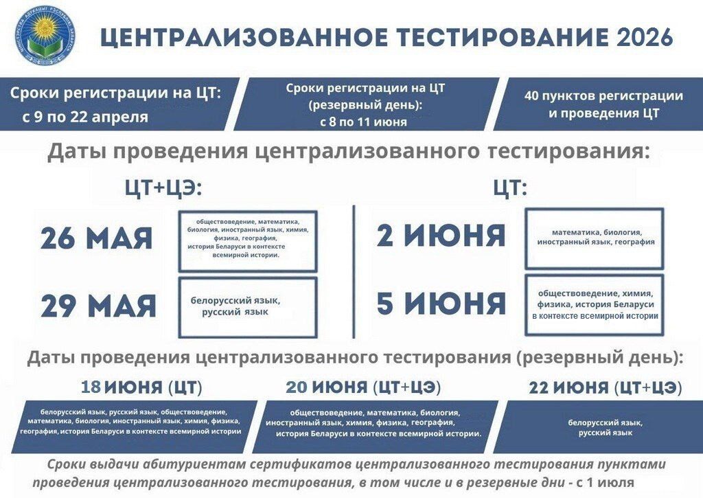 Министерство образования Беларуси утвердило график проведения централизованного тестирования (ЦТ) по учебным предметам в 2026 году. Соответствующее постановление № 166 от 17 сентября размещено на Национальном правовом интернет-портале.