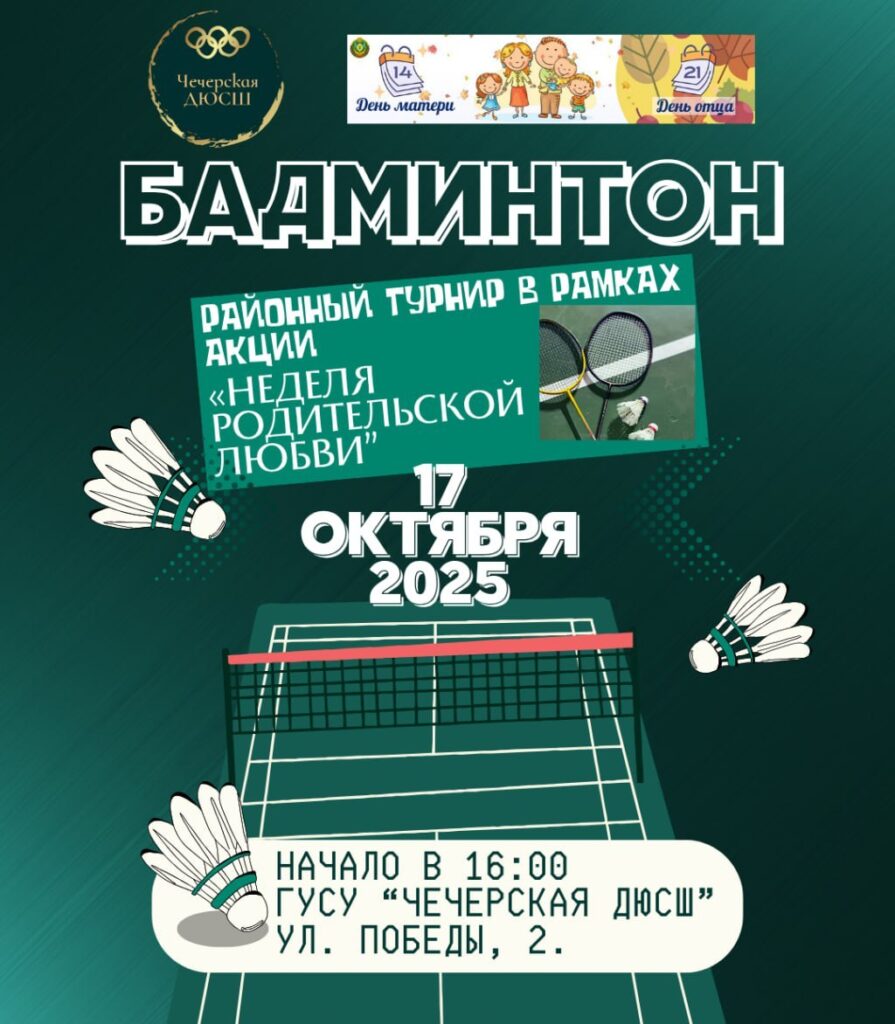 Анонс В Чечерске пройдет районный турнир по бадминтону 14.10.2025 Иллюстративное фото из открытых источников 17 октября в детско-юношеской спортшколе пройдет районный турнир по бадминтону, приуроченный к Неделе родительской любви. Начало в 16.00. Организаторы приглашают всех желающих с пользой провести время. Поделиться информацией: Continue Reading Previous Что можно посмотреть в чечерском кинотеатре “Октябрь” с 15 по 19 октябряNext В Чечерске 17 октября пройдет районный этап областного конкурса “Лучшая молодая семья Гомельщины-2025” More Stories Анонс 17 апреля в Чечерском районе пройдет Пасхальный фестиваль 14.04.2026 Анонс Что можно посмотреть в кинотеатре “Октябрь” 16-19 и 22 апреля 13.04.2026 Анонс Что можно посмотреть в кинотеатре “Октябрь” 9-12 и 15 апреля 06.04.2026 Добавить комментарий Отменить ответ Ваш e-mail не будет опубликован.Комментарий Имя E-mail Сайт Δ Этот сайт использует Akismet для борьбы со спамом. Узнайте, как обрабатываются ваши данные комментариев.