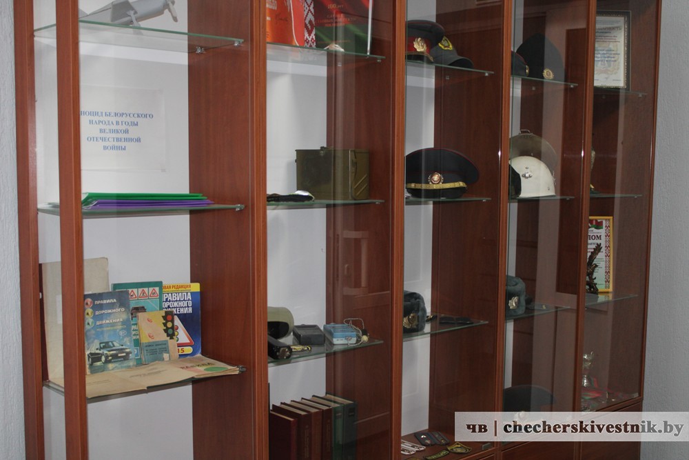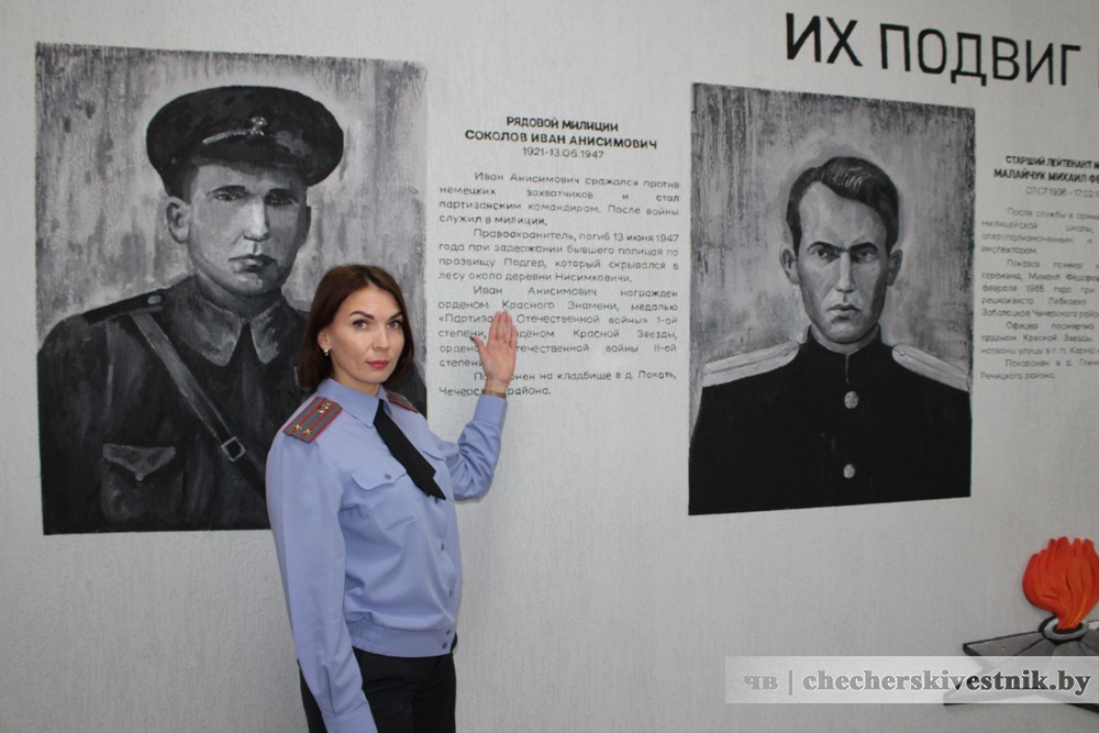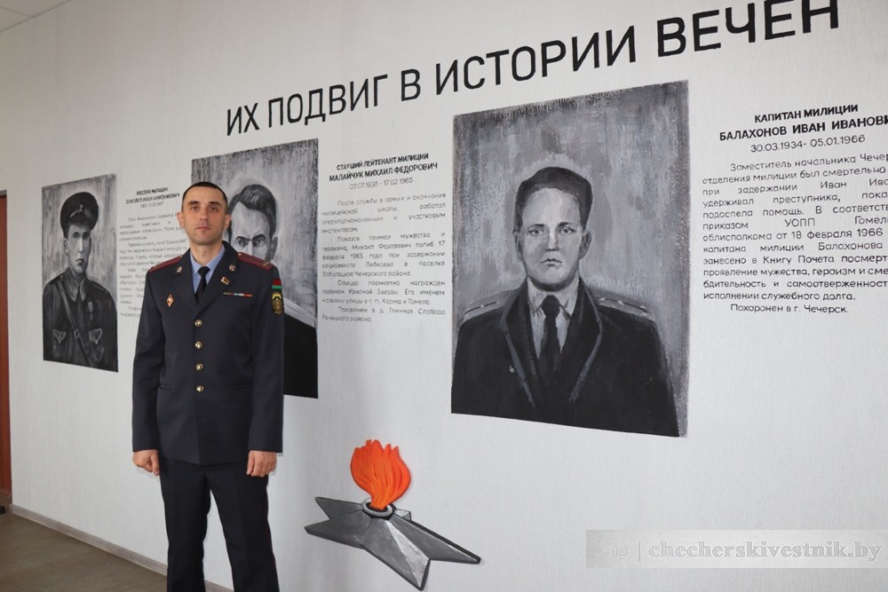 Ко Дню народного единства в 2021 году в Мещанском лесу торжественно открылся музей под открытым небом “Чечерский рубеж”, одну из ключевых ролей в создании которого сыграли правоохранители. В нынешнем на втором этаже административного здания появилась стена памяти, где при содействии специалистов районного центра творчества детей и молодежи запечатлены лица героев-милиционеров, чьи подвиги стали легендарными. Стенды с раритетными экспонатами, словно мост между прошлым и настоящим, напоминают молодым сотрудникам о тех, кто ценой своей жизни защищал мир и спокойствие. Особое место занимает плеяда героев военного времени, чья отвага и самоотверженность позволили нам жить под мирным небом. Здесь гордятся Василием Мамекиным, боровшимся с фашистами в составе 1-й Гомельской партизанской бригады им. Калинина, Георгием Стальченко, участвовавшем в боях за взятие Берлина, Иваном Соколовым, награжденным посмертно орденами Красной Звезды и Красного Знамени, Иваном Балахоновым, погибшем при исполнении служебного долга и многими другими.