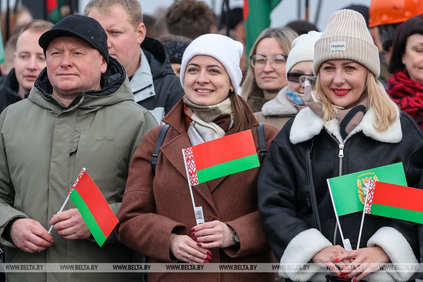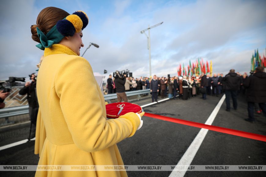 Глава государства в торжественной обстановке перерезал символическую красную ленточку. На церемонию были приглашены представители трудовых коллективов дорожных организаций, участвовавших в строительстве моста, жители Мозырского района. По сложившейся традиции ко Дню Октябрьской революции людям преподносят подарки – значимые, масштабные объекты, и обновленный мост – один из них.