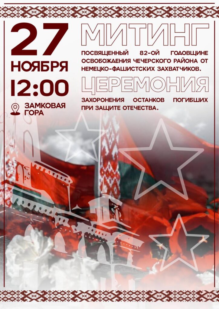 27 ноября в 12.00 на Замковой горе пройдет митинг, посвященный 82-ой годовщине освобождения Чечерского района от немецко-фашистских захватчиков, а так же церемония захоронения останков погибших при защите Отечества.