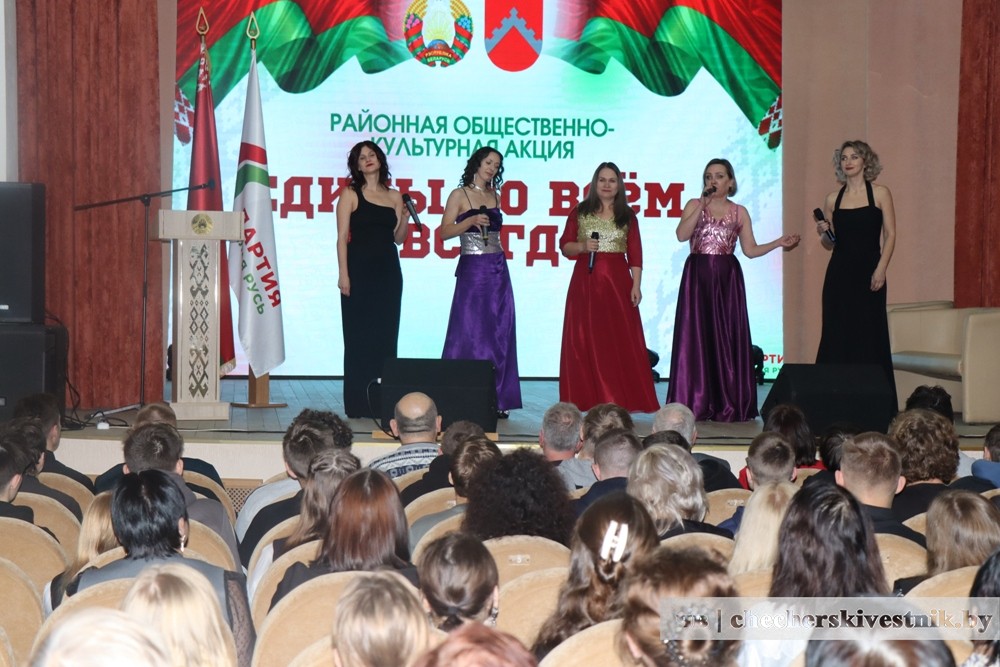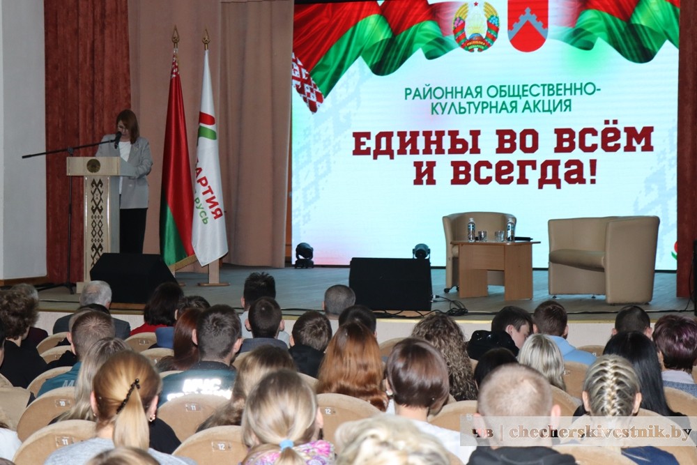 Далее в районном Доме культуры состоялась общественно-культурная акция “Едины во всем и всегда”. Во время диалоговой площадки говорили о важности сохранения исторической памяти, об ответственном отношении каждого к своим обязанностям на местах, о поддержании курса, которым идет наша страна благодаря Президенту Александру Лукашенко. Озвученные темы откликались в сердцах чечерян, ведь им не безразлична судьба Родины.
