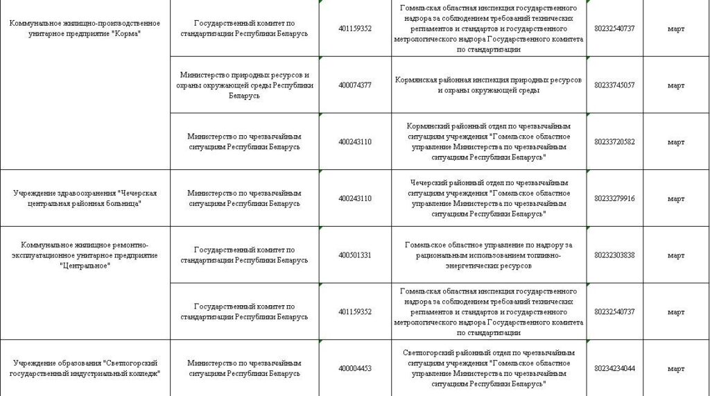 Наибольшее количество проверок запланировано органами МЧС (28% от общего количества), Минтруда и соцзащиты (19%), Госстандарта (18%), Минфина (12%), Минприроды (11%). Комитетом госконтроля Гомельской области – 7 проверок (2,4%).