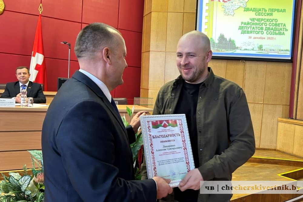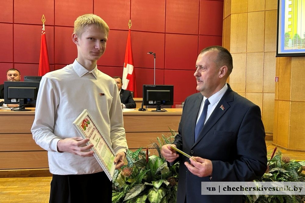 Отрадно, что награды находят и молодых, инициативных жителей района. Благодарность также вручена Дмитрию Орлову, учащемуся второй городской школы, члену Молодежного совета при Чечерском райсовете депутатов, — за активную гражданскую позицию и личный вклад в реализацию проектов Совета.
