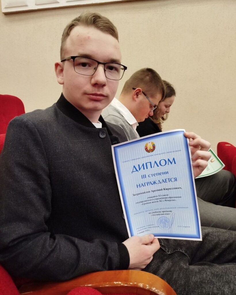 Учащийся второй городской школы Арсений Затримайлов блестяще справился с заданиями по английскому языку и также стал обладателем диплома третьей степени. Готовился он к олимпиаде вместе с учителем Ириной Юрьевной Ружицкой.