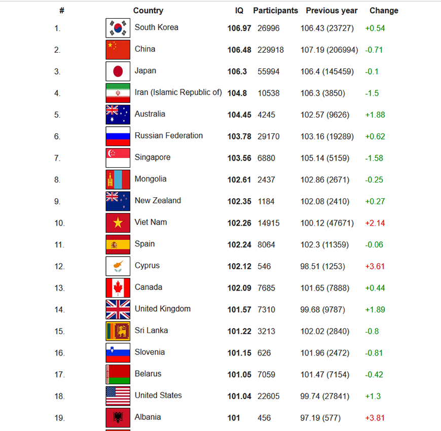 В основу обновленного рейтинга среднего IQ легли результаты более 1,2 млн человек, прошедших один и тот же интеллектуальный тест в течение 2025 года. Всего в рейтинг попали 137 стран. Средний показатель уровня интеллекта, принимаемый за расчетный, составил 100.