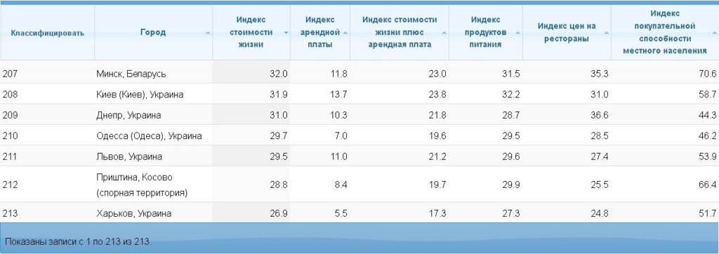 Столица Беларуси расположилась на 207 строчке списка из 213, Москва (Россия) – на 164, Прага (Чешская Республика) – 121, Рига (Латвия) – 133, Варшава (Польша) – 140, Киев (Украина) – 208.
