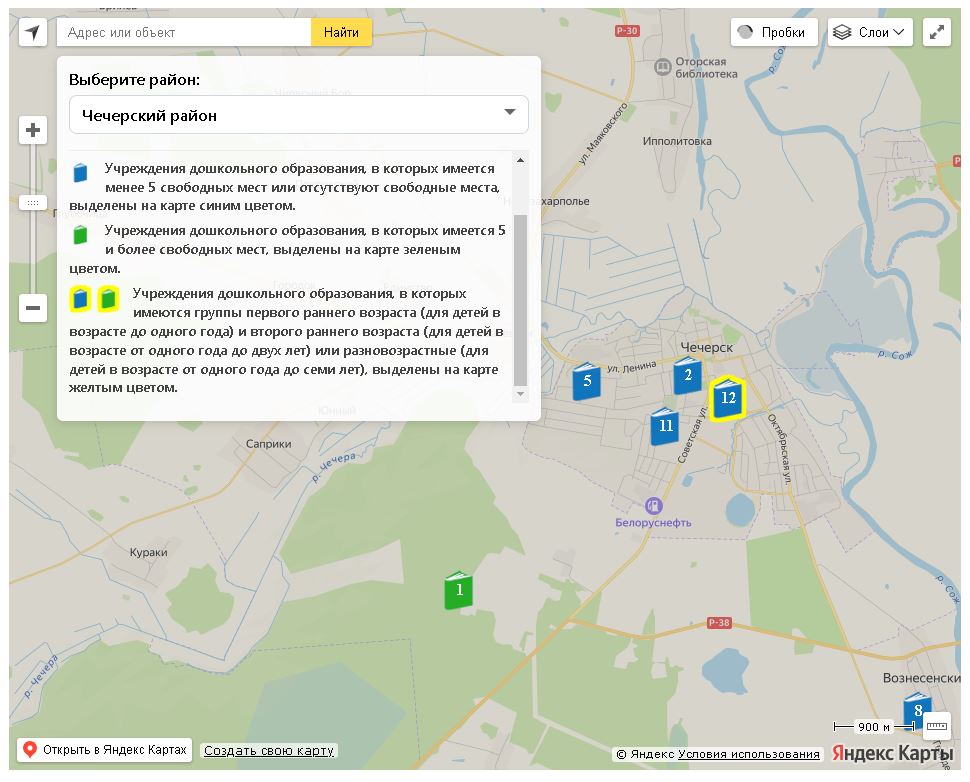 Пользоваться картой достаточно просто: наведите курсор на значок сада, во всплывающем окне будет показано наличие свободных мест, полное название учреждения и контакты.